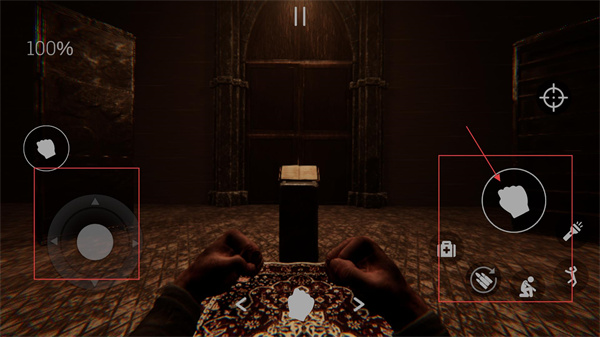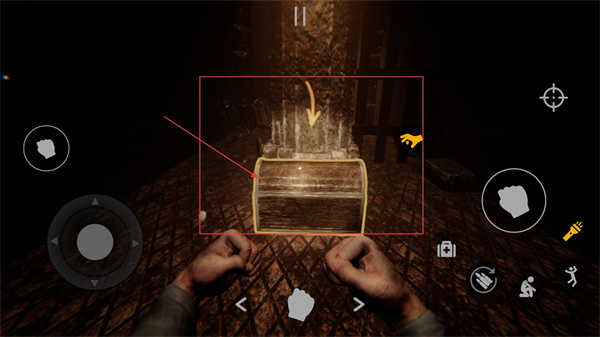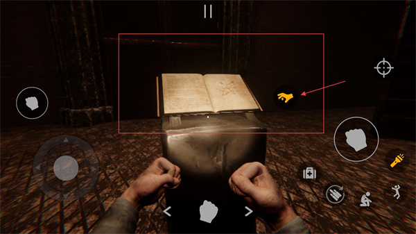 1、在昏暗场景中,通过左侧摇杆控制角色移动,靠近目标物品,同时利用右侧交互键(手掌图标)触发物品查看。