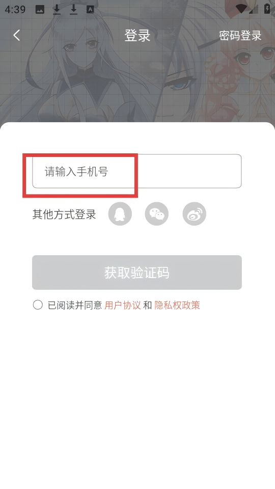 4、选择手机登录后,在【请输入手机号】处填写手机号,勾选协议后点击【获取验证码】完成登录。