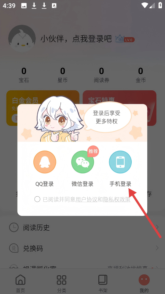 3、点击登录后,可选择【手机登录】,勾选协议即可登录。