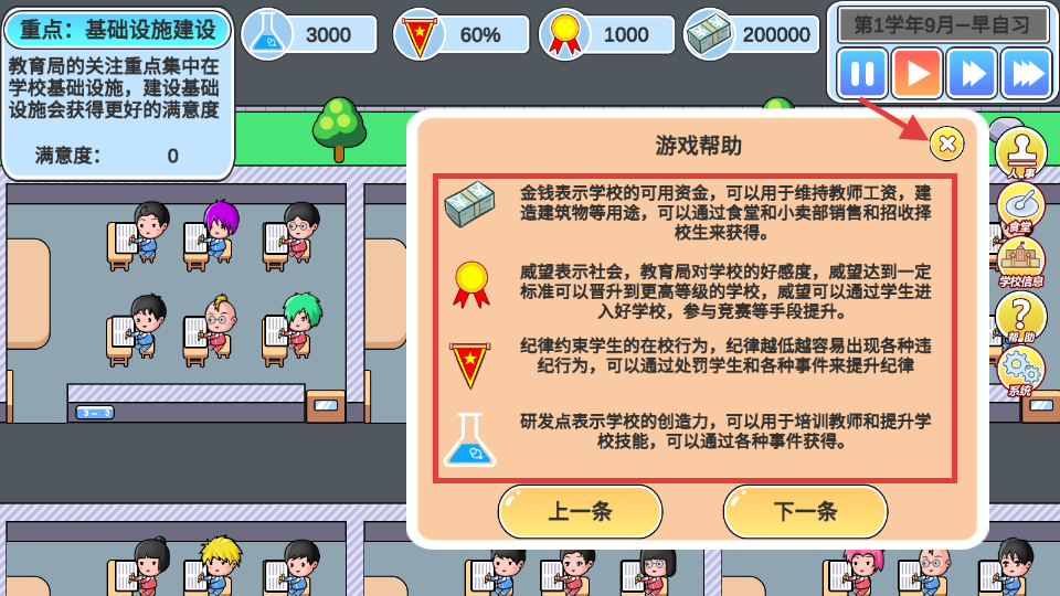 2、阅读【游戏帮助】,明晰金钱、威望、纪律、研发点作用,为学校经营做规划。
