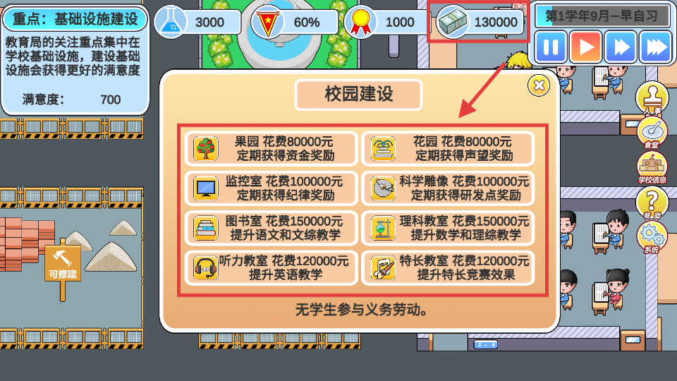 4、根据资金【130000】,从【校园建设】选建筑,如果园获资金或教室提教学,优化校园。