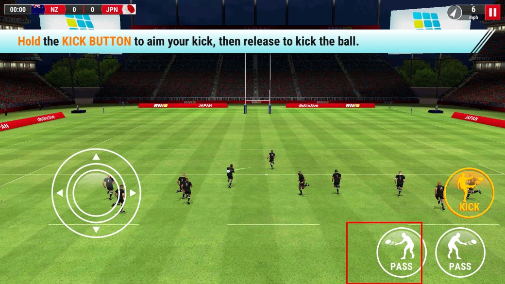 2、按住【KICK】按钮瞄准,松开后踢球;点击【PASS】按钮传球。