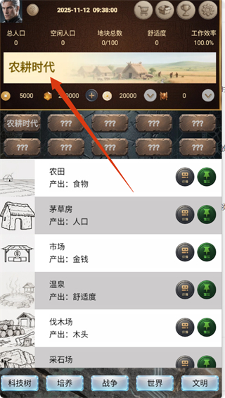 1、进入游戏【农耕时代】,可建造农田、茅草房等建筑,分别产出食物、人口等资源,同时关注总人口、空闲人口等数据。