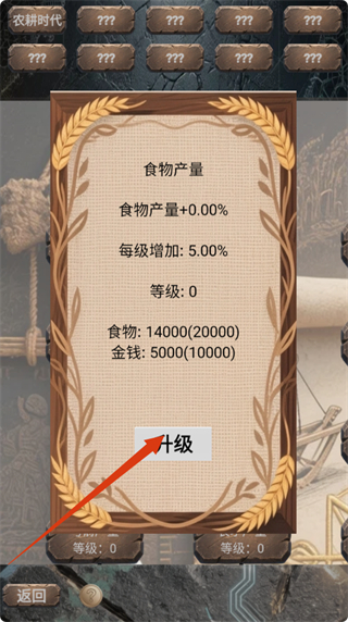 2、可升级食物产量,每级增加5.00%,升级需消耗相应食物和金钱,提升资源产出效率。