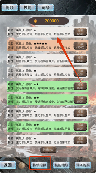 3、在将领招募界面,可花费资源招募不同星级的英雄,英雄特性各异,合理招募以增强部队实力。