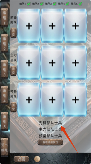 4、进行部队编组,可设置先锋、主力、预备部队,添加士兵组成编队,提升部队作战能力,为战争做好准备。