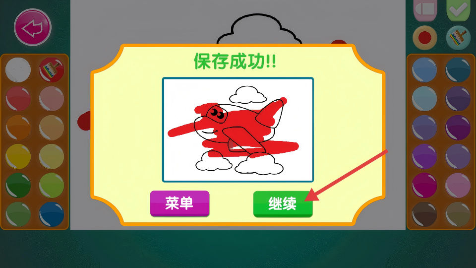 3、在涂色界面,给飞机等图案涂好颜色后,点击右上角的【√】按钮。