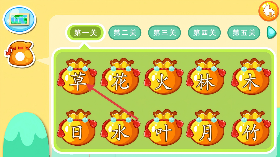 4、在冒险地图页面,可以查看右侧箭头标志,开始汉字学习。