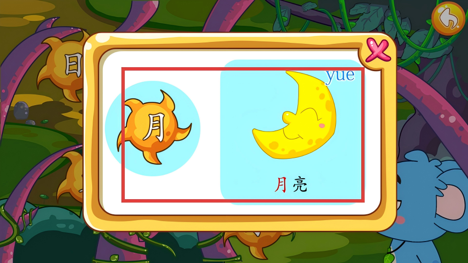 4、在汉字学习弹窗中,可认识【月】字,了解其对应月亮的含义。