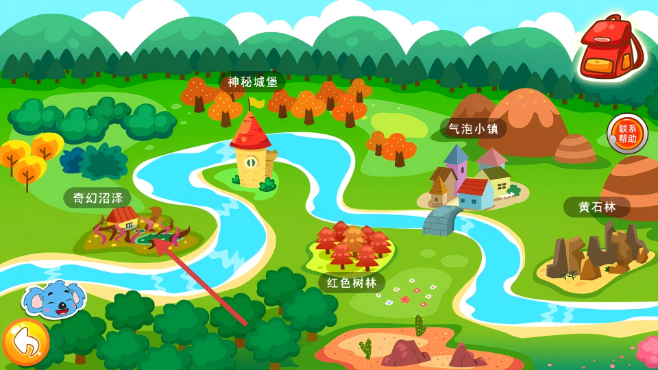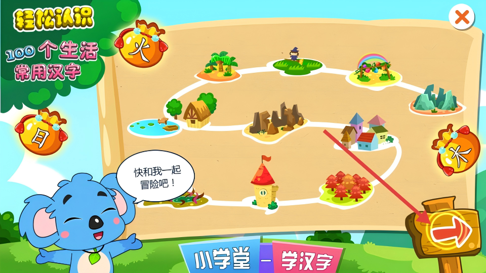 1、在冒险地图页面,点击右侧箭头标志,开始汉字冒险学习。