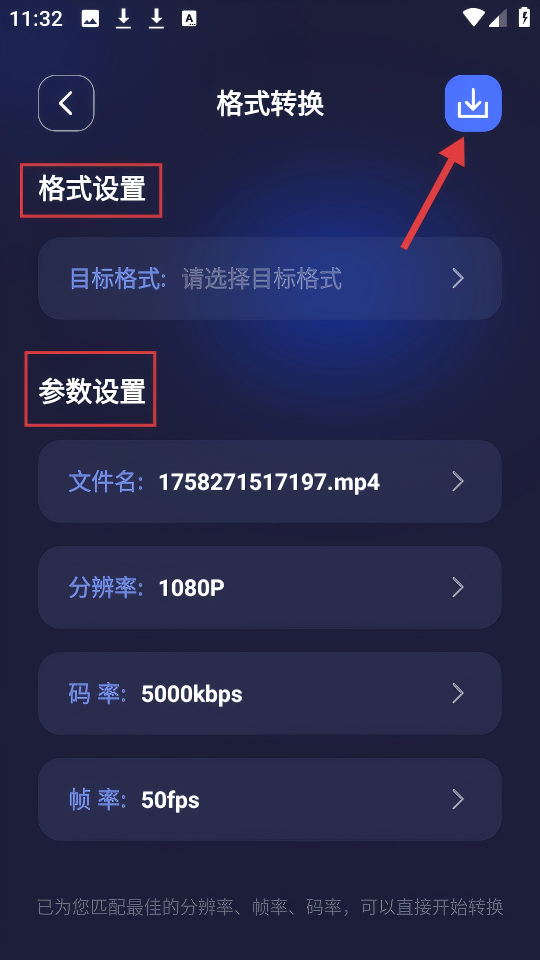 4、在格式转换页面,设置好【格式设置】和【参数设置】后,点击右上角下载按钮,开始视频格式转换。