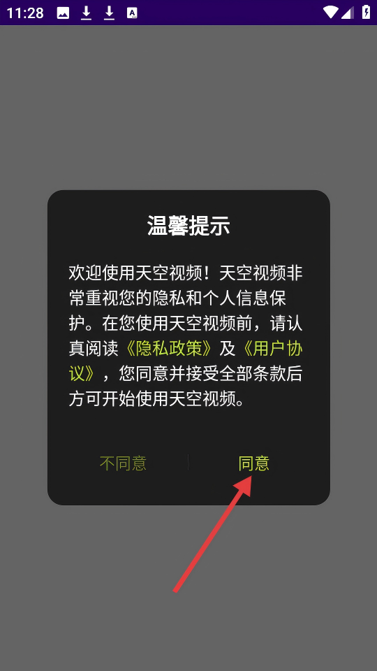 1、在温馨提示弹窗中,点击【同意】按钮,接受《隐私政策》及《用户协议》,开始使用天空视频。