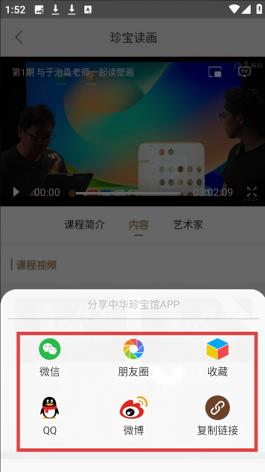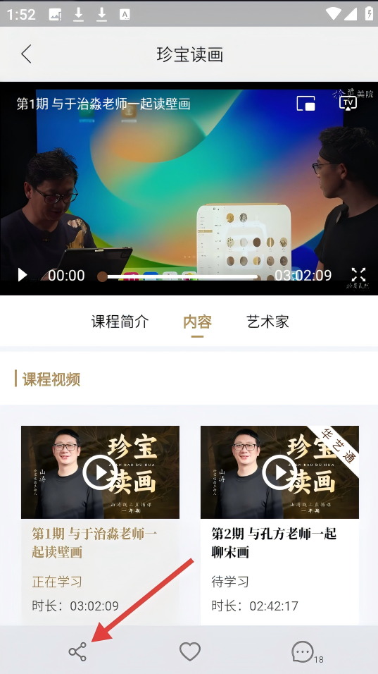 3、进入【珍宝读画】课程内容页后,点击左下角分享图标。