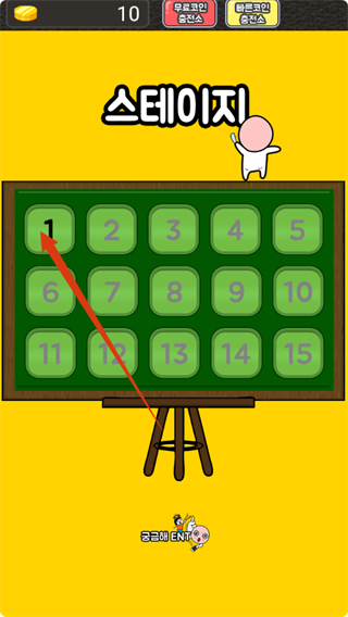 1、进入游戏,点击【1】进入第一关,开始游戏挑战,留意上方的金币和功能按钮。