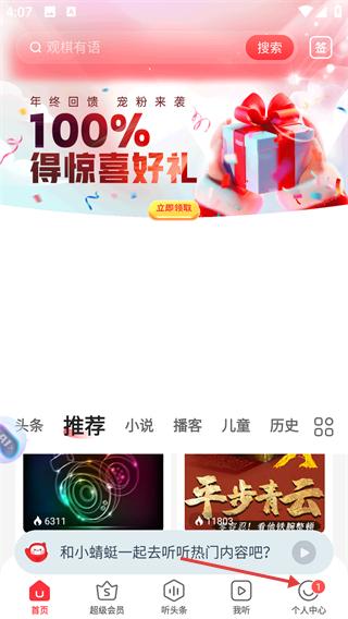 1、打开蜻蜓FM主界面,点击底部导航栏中的个人中心选项进入对应页面。