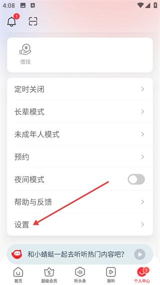 2、在个人中心页面找到设置选项,点击该选项进入应用的设置界面。