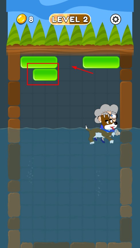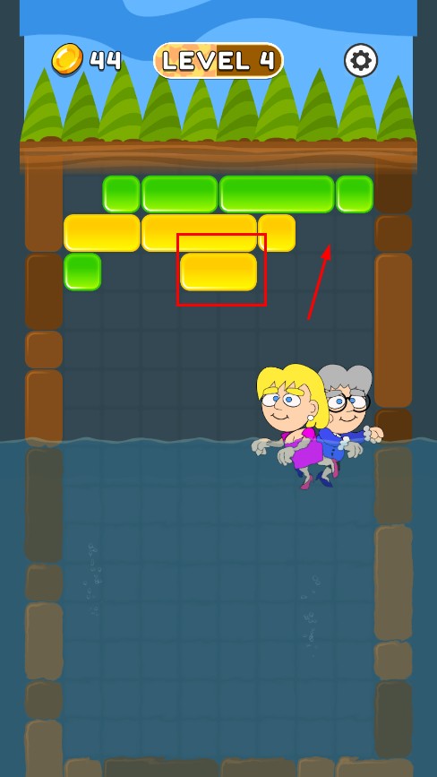 1、点击或拖动红色方块连排消除,为水中角色搭建向上的路径。