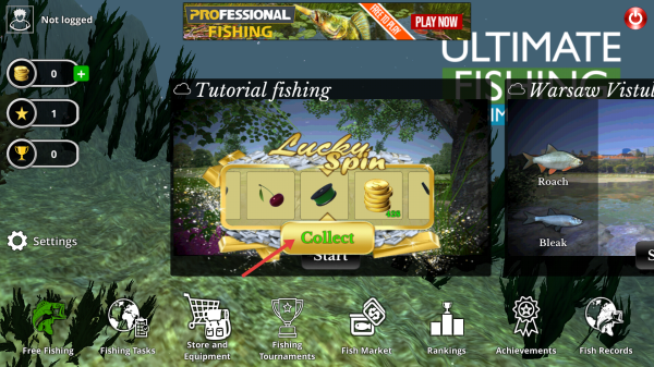 2、在【Tutorial-fishing】界面点击【Collect】,领取幸运转盘的奖励。
