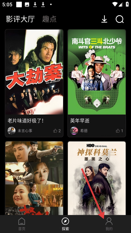 1、在影评大厅,点击底部【我的】,进入【我的】页面。