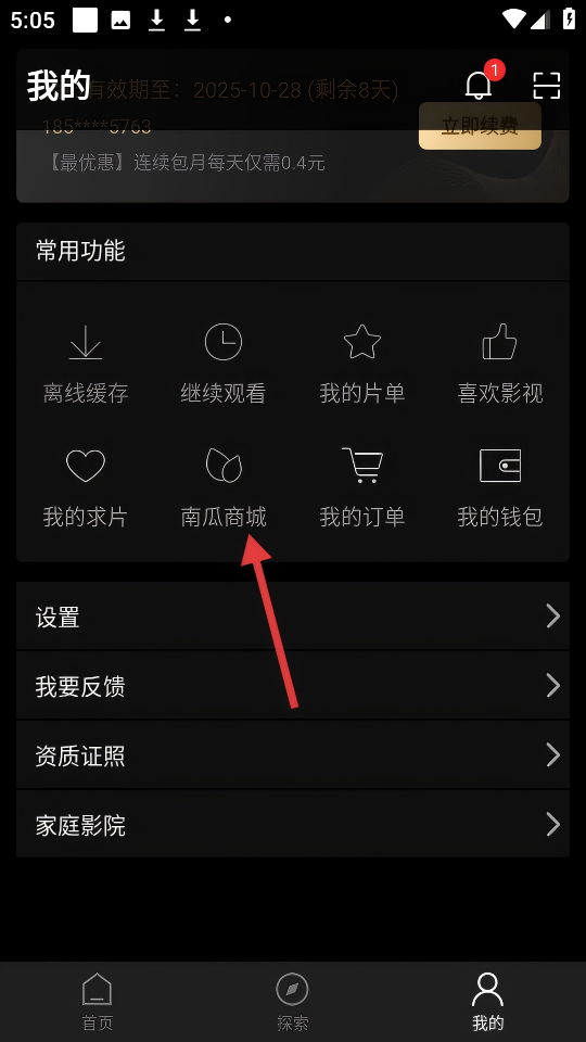 2、在【我的】页面,点击【南瓜商城】,进入商城页面。