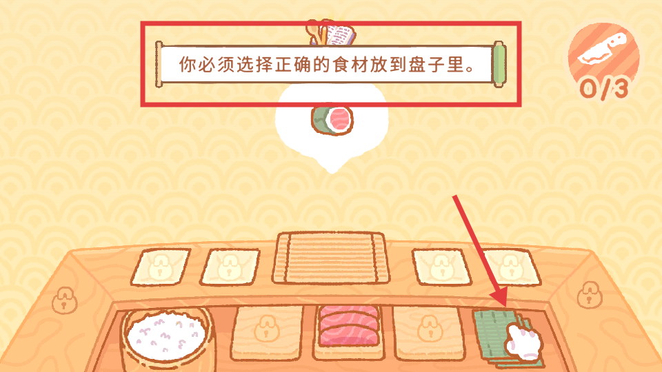 1、制作料理时,根据提示选择正确的食材,如绿色海苔,放到盘子里,确保食材搭配准确。