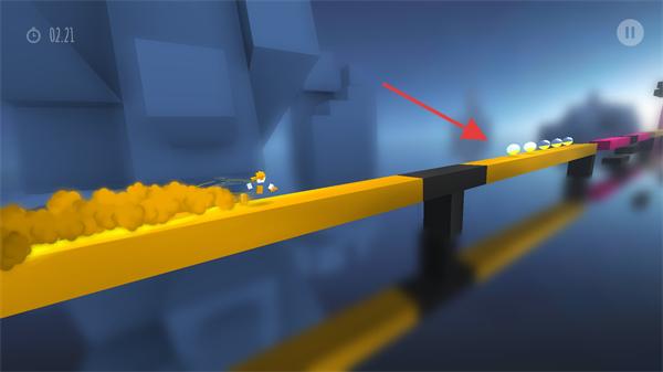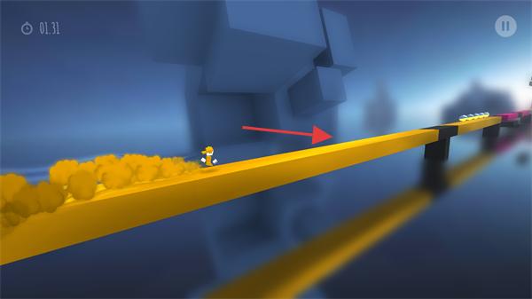 在游戏中奔跑的平台将分为红色与黄色两种,玩家在什么颜色的平台上奔跑,就需要让角色变身成为什么颜色,否则就会在瞬间粉身碎骨,所以玩家就需要在恰当的时候点击左侧屏幕来让角色摇身一变成为另外一种颜色。