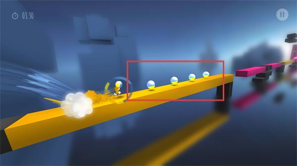 4、在黄色跑道上收集【白球】道具,同时触发冲刺特效,提升前进速度。
