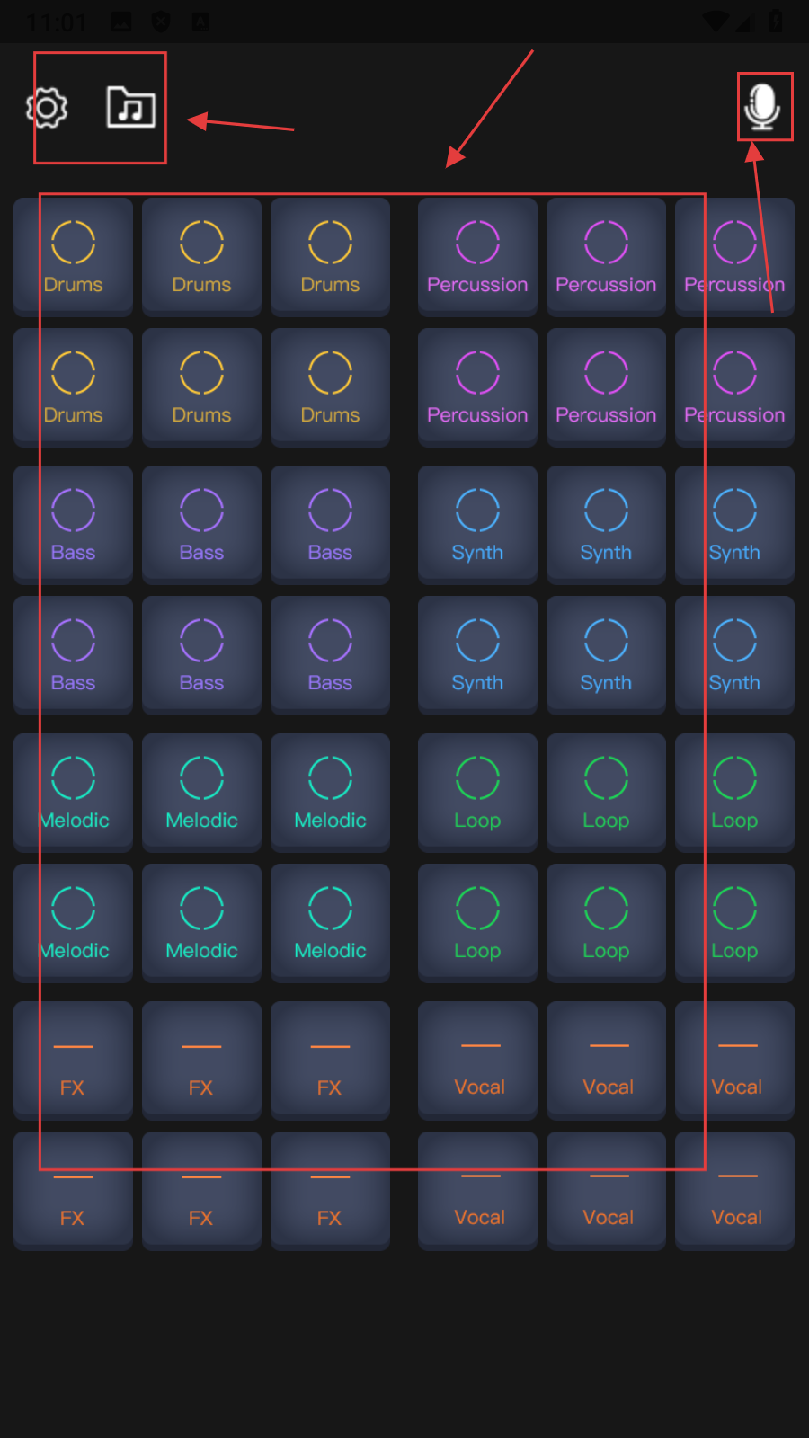 1、在音乐制作界面,可点击【Drums、Percussion】等音色块创作节奏,还能使用【设置、文件、录音】功能,开启音乐制作。
