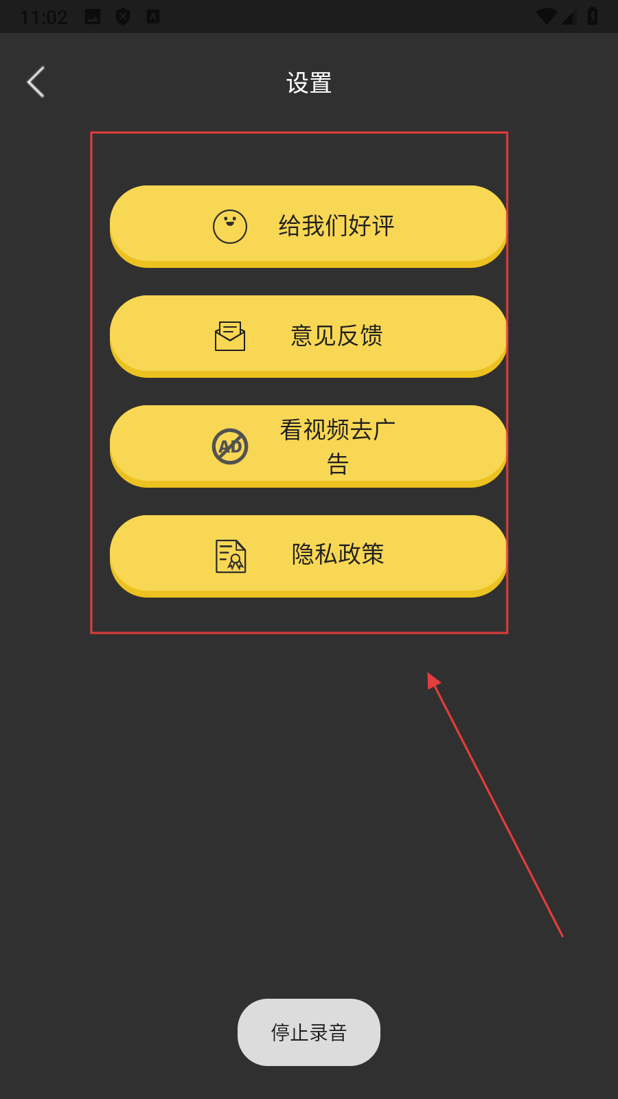 2、进入设置界面,能【给我们好评、意见反馈】,也可【看视频去广告、查看隐私政策,还能停止录音】。