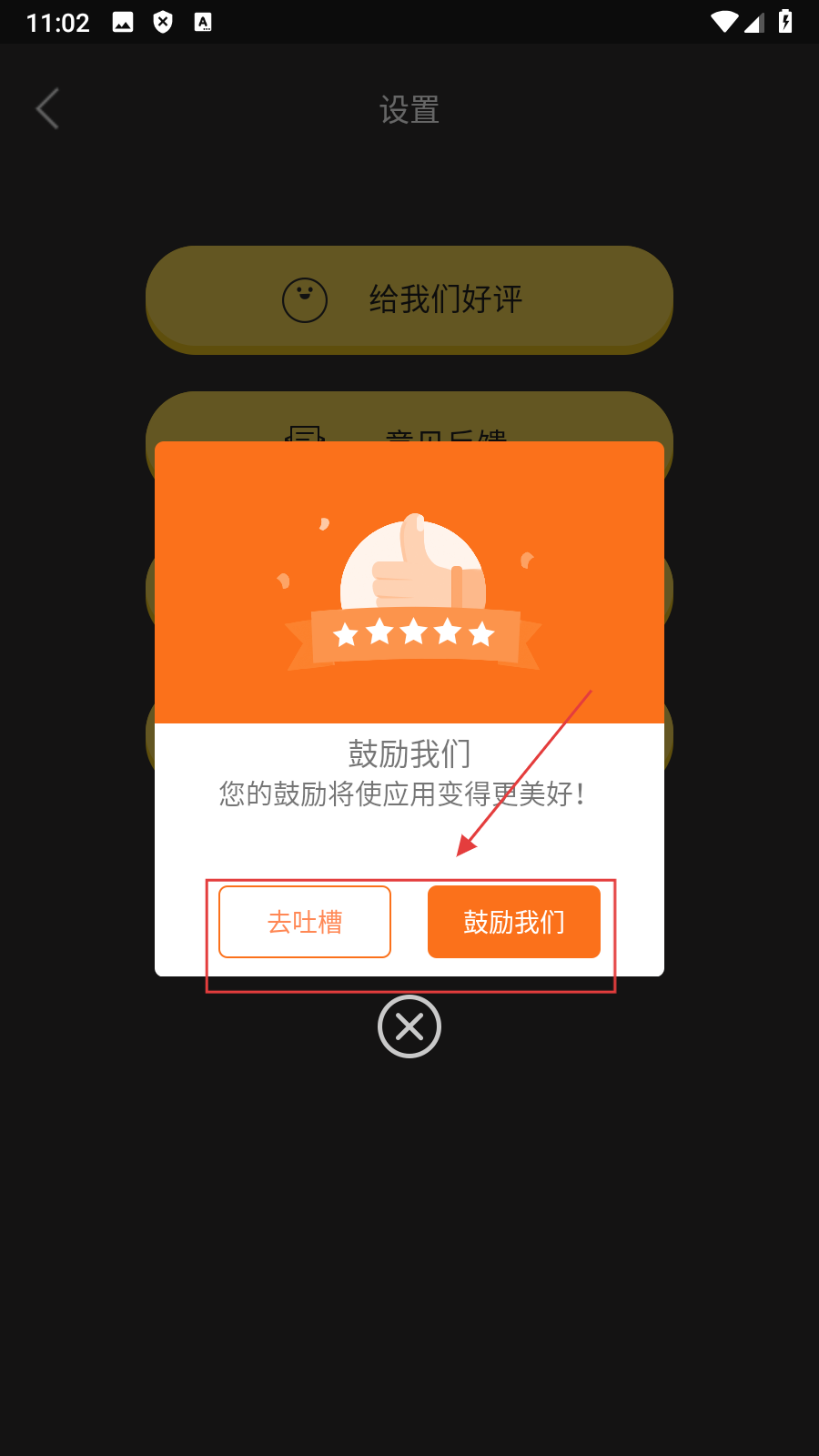 4、弹出鼓励弹窗,可选择【去吐槽】反馈问题,或点击【鼓励我们】给予好评,助力应用优化。