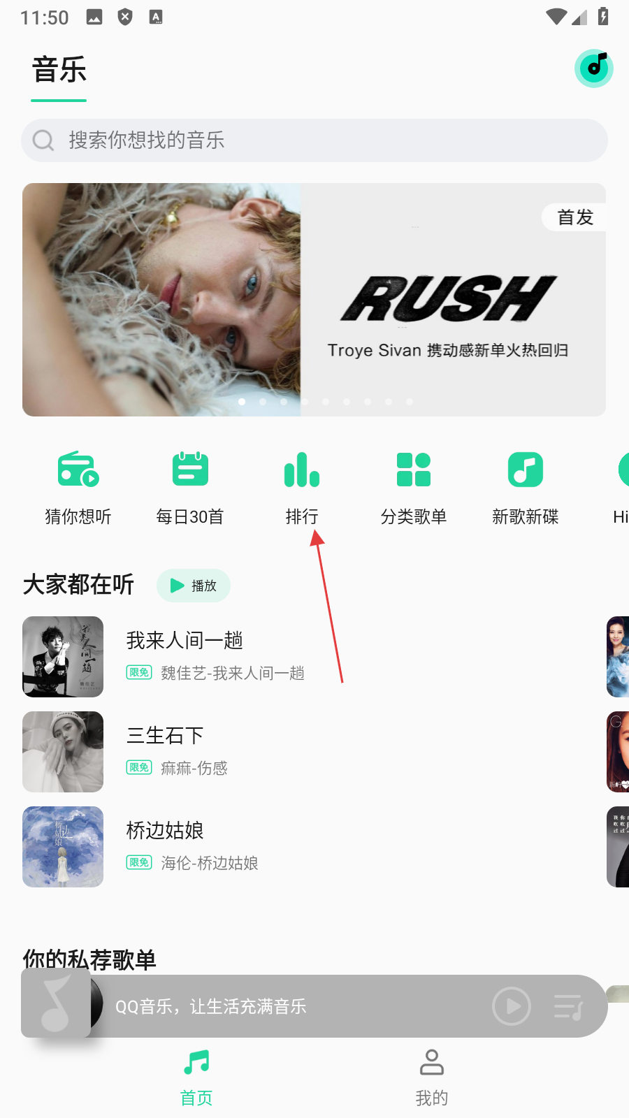 1、在首页,点击【排行】,进入QQ音乐排行榜页面。