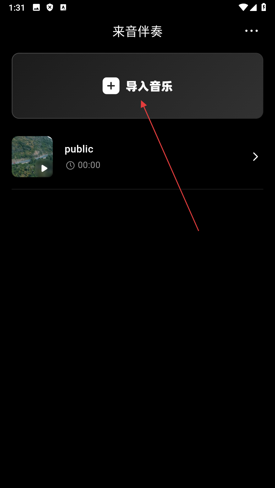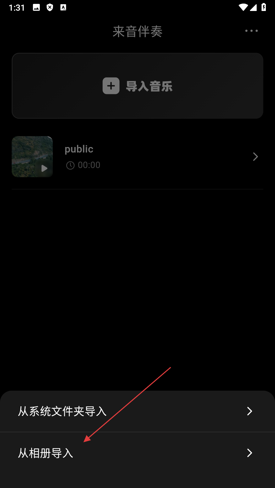 1、在来音伴奏界面,点击【导入音乐】,弹出音乐导入的选项列表。