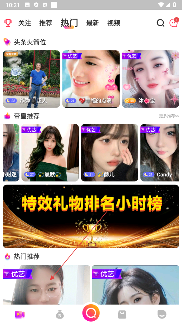 1、在热门页面,点击【心仪的主播】,进入该主播的直播间。