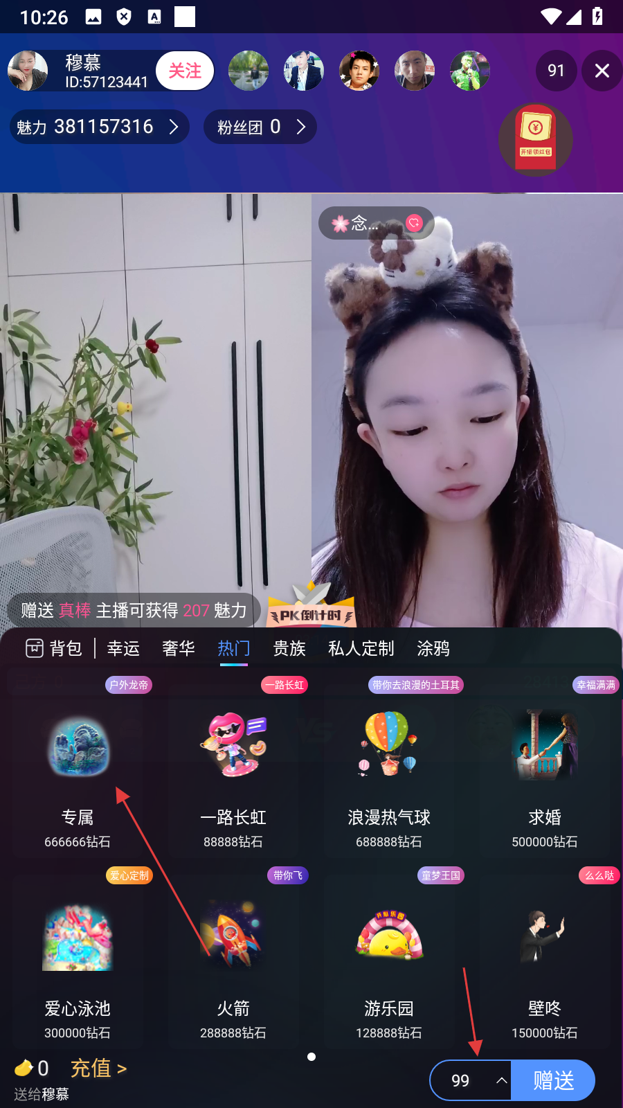 4、【设置好礼物数量】后,点击【赠送】,即可完成给主播送礼物的操作。