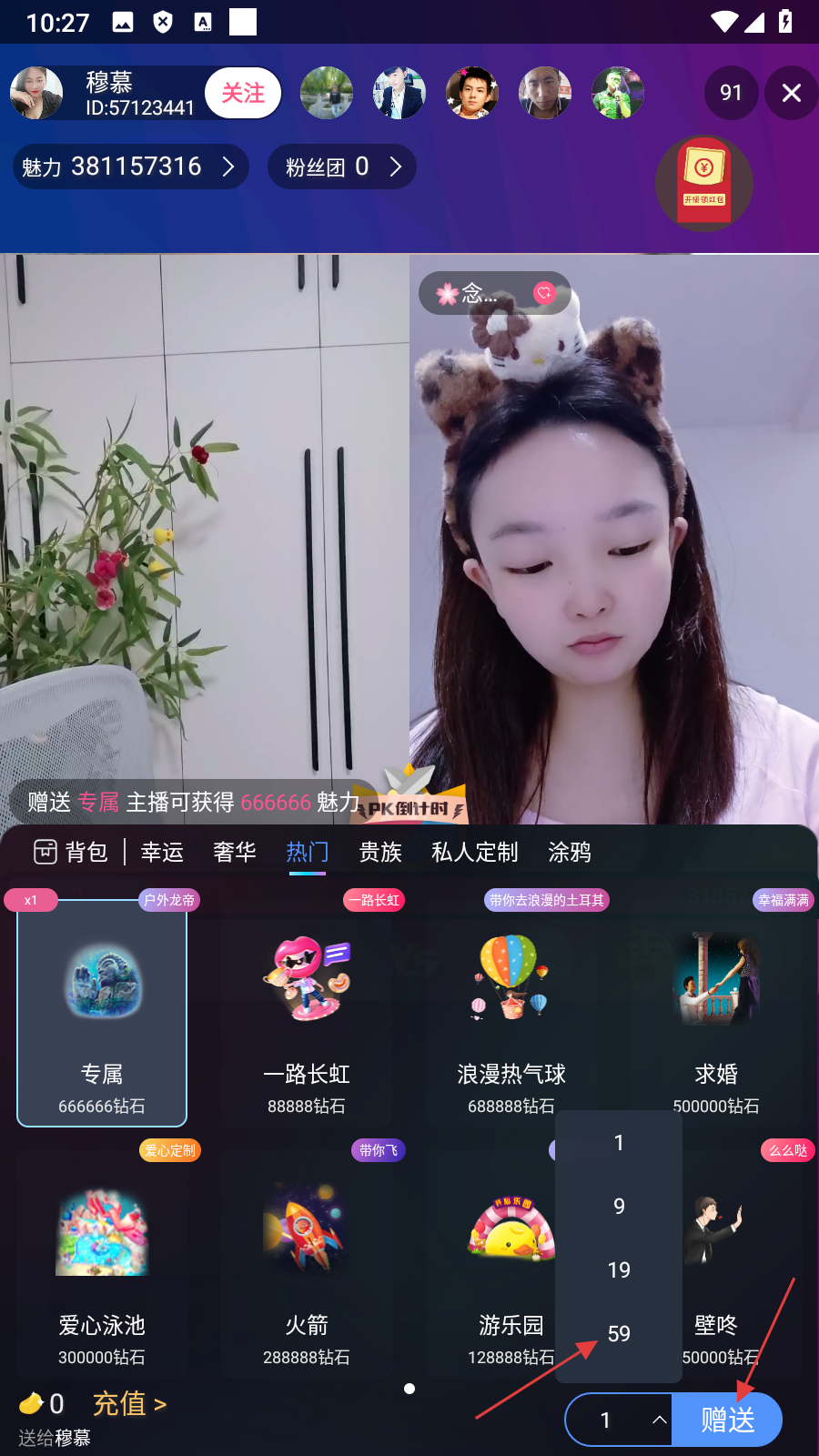 3、在礼物选择面板中,选择要【赠送的礼物】,并点击【赠送数量图标】。