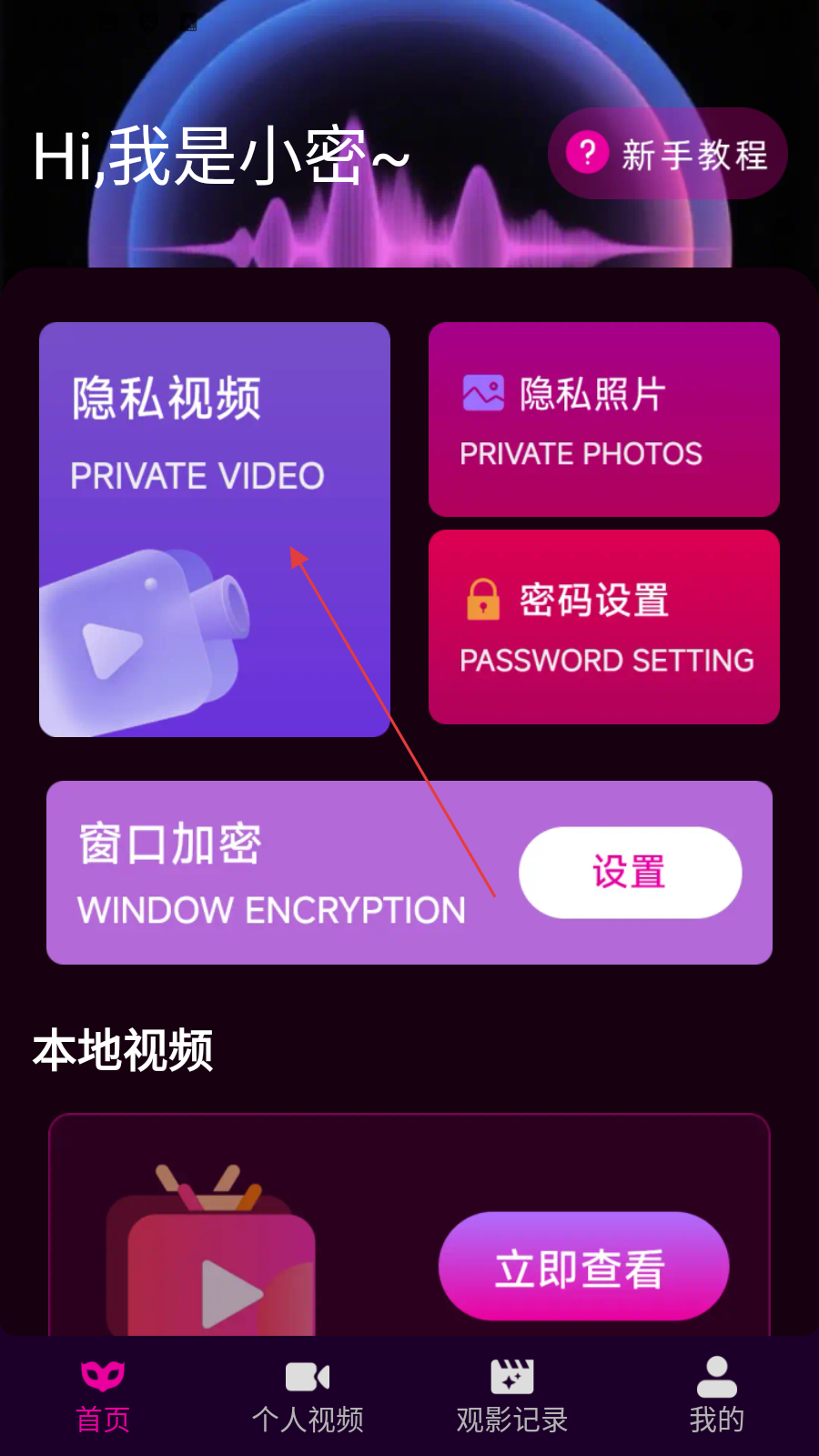 1、在首页,点击【隐私视频】,进入私密视频管理页面。