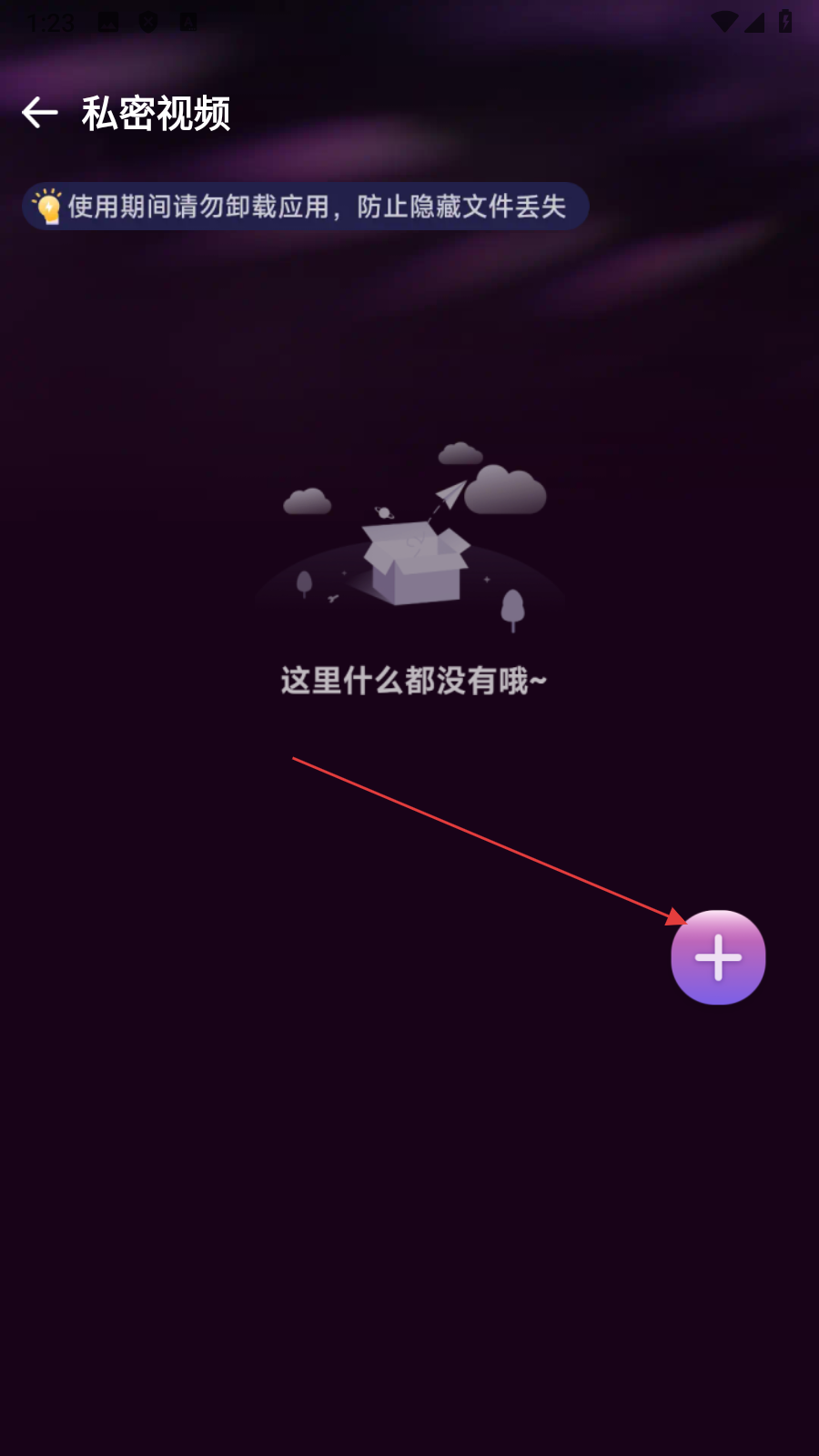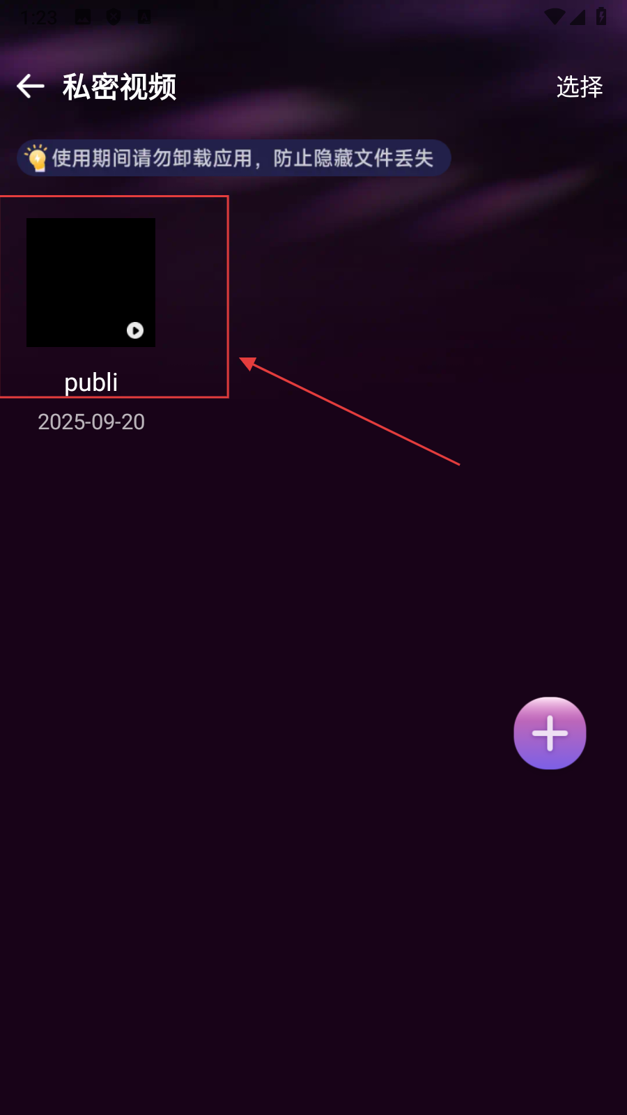2、在私密视频页面,点击右下角【+】号,进入视频选择界面。