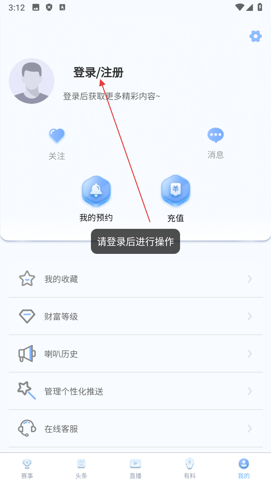 2、在个人中心页面,点击【登录/注册】,进入登录选择界面。