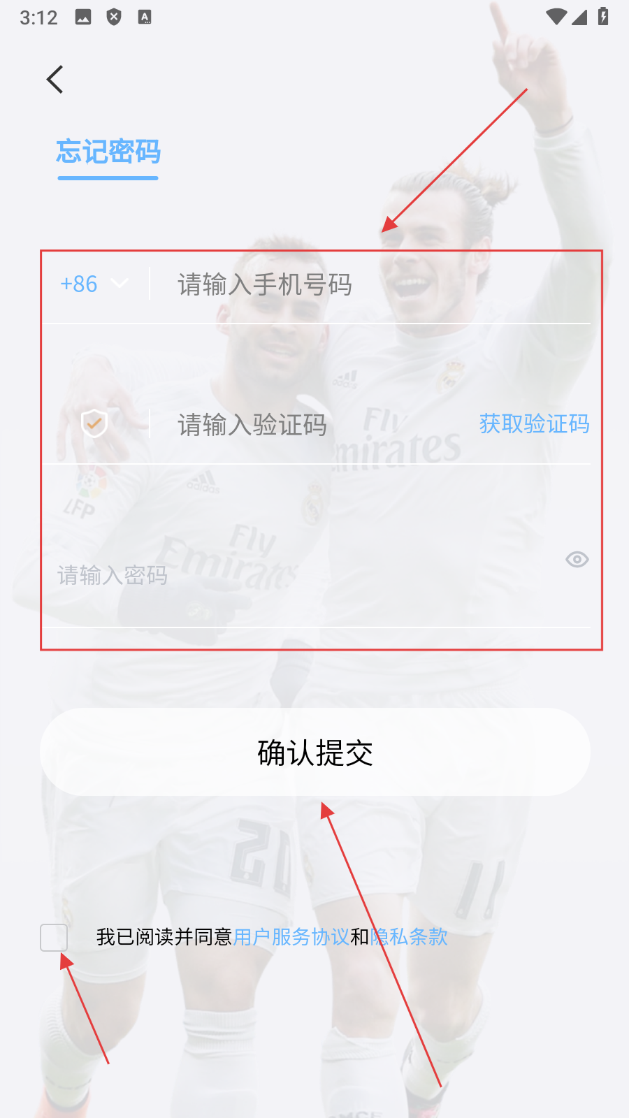 4、输入【手机号码、验证码、新密码,勾选协议】后点击【确认提交】,即可完成密码重置。