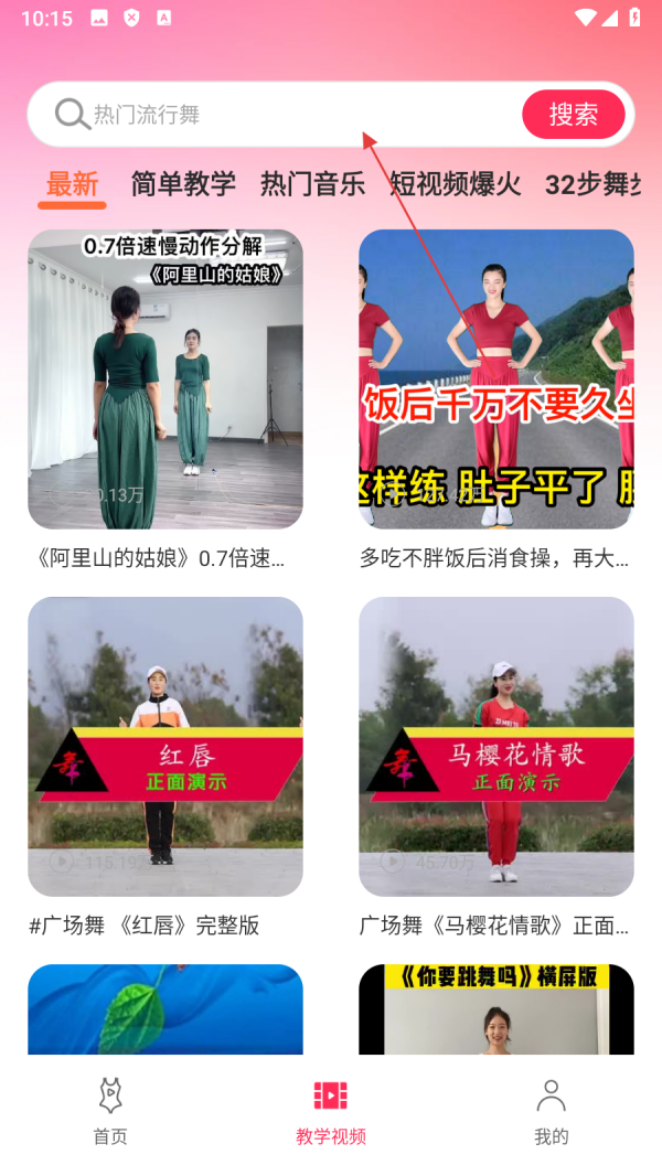 2、在教学视频页面,点击【顶部搜索栏】,进入搜索界面。
