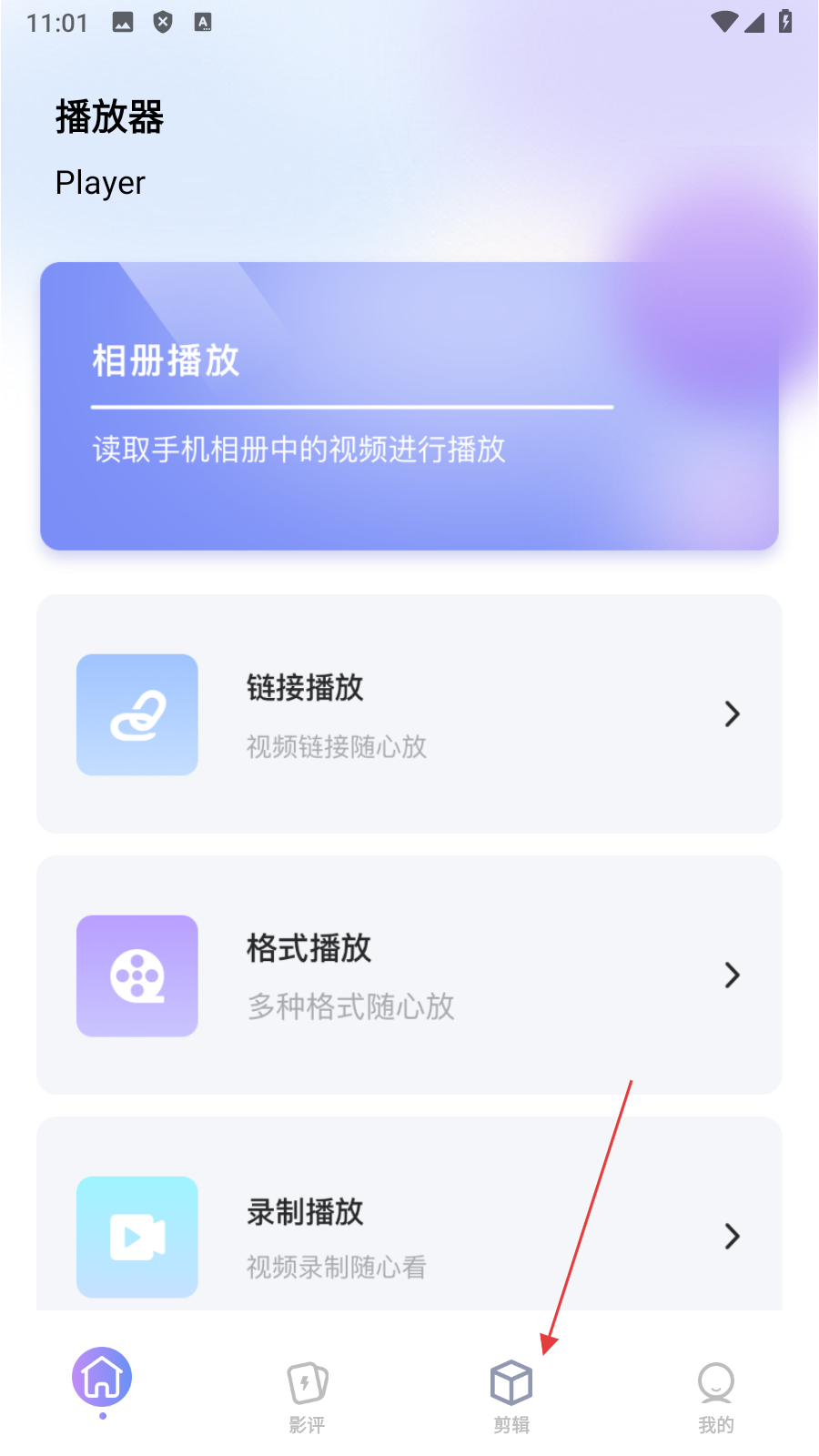 1、在播放器页面,点击底部【剪辑】,进入视频编辑页面。