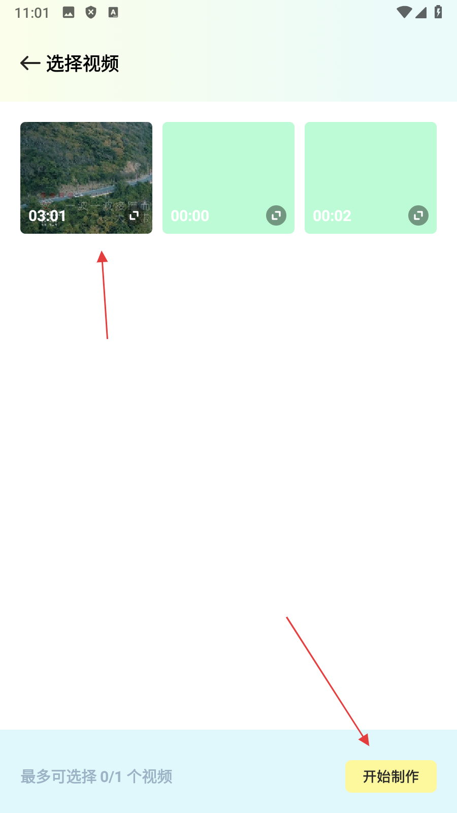 3、在选择视频界面,勾选【心仪的视频】后点击【开始制作】,进入视频剪切界面。