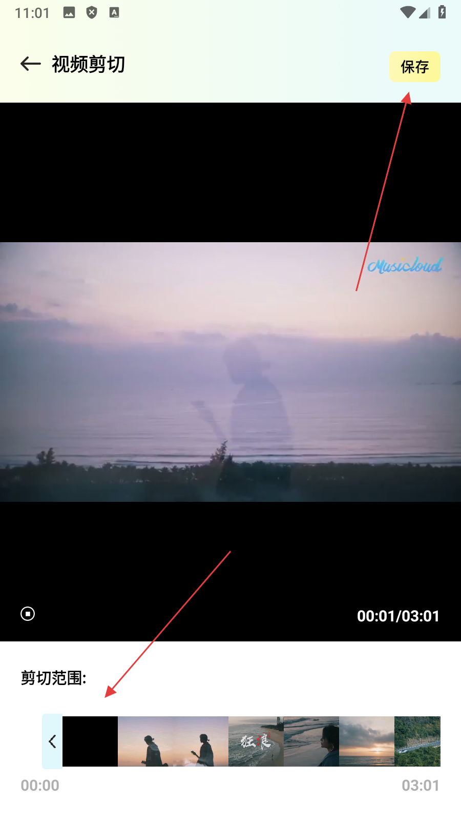 4、在视频剪切界面,【调整好剪切范围】后点击【保存】,即可完成视频剪切操作。