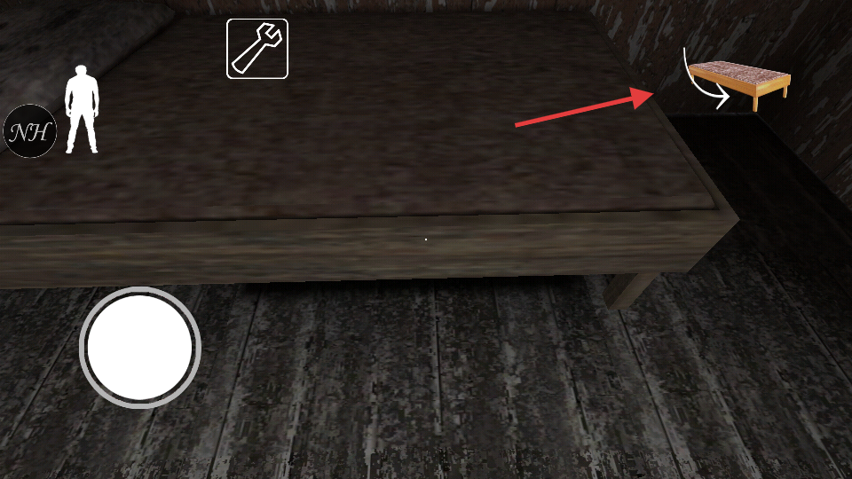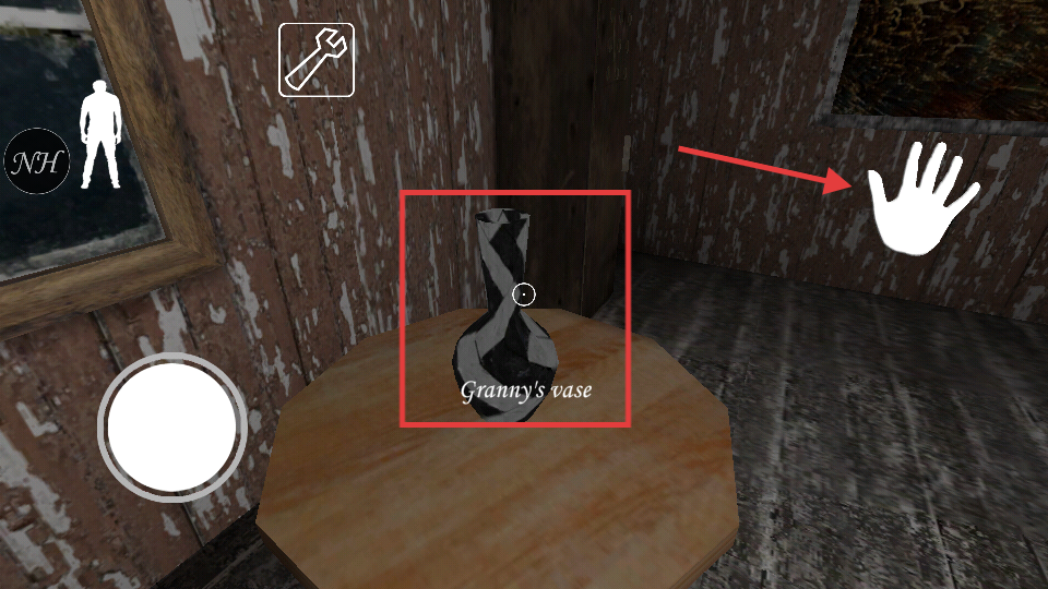 2、靠近桌子上的【Granny'svase】,点击白色互动手图标拾取花瓶,可用于后续解谜或干扰奶奶。