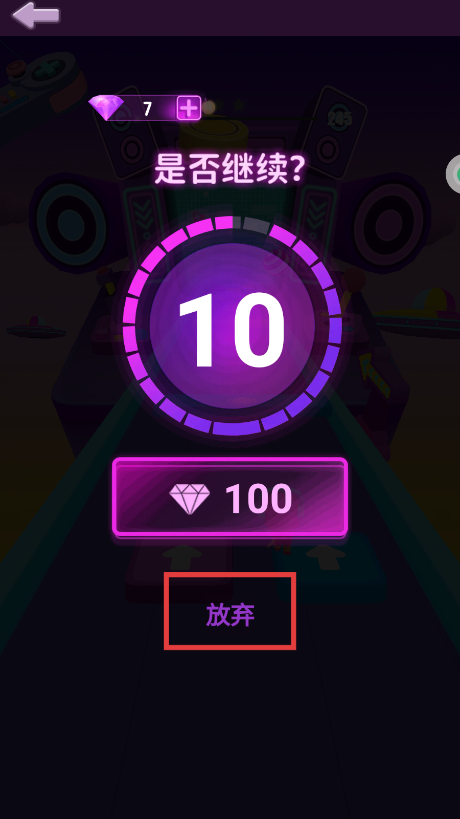 4、若游戏失败,会出现“是否继续?”的提示,可选择花费钻石继续或点击【放弃】重新开始。
