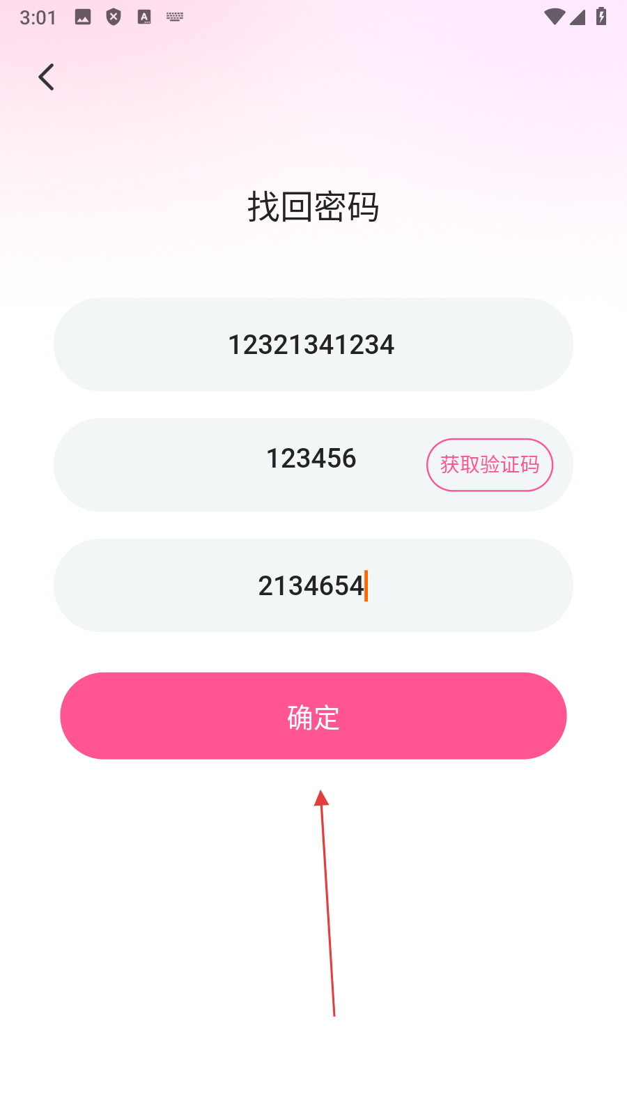 3、在找回密码页面,依次【输入手机号、验证码和新密码】,准备完成密码找回。