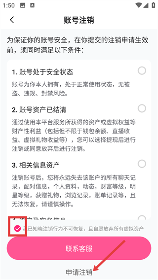4、在【账号注销】页,勾选知晓条款后,点【申请注销】,就能提交账号注销申请啦。