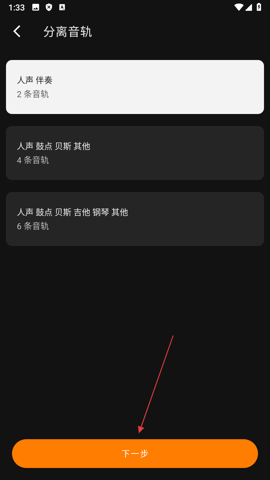4、在分离音轨页面,选择音轨分离模式后点击【下一步】,即可开始人声分离操作。
