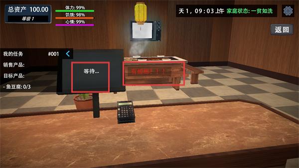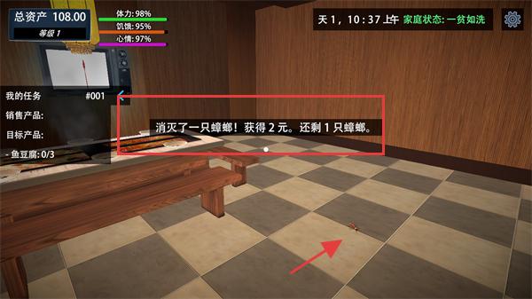 4、完成结算后,会触发消灭蟑螂的任务,成功后总资产增加(如+2元),继续推进店铺经营。