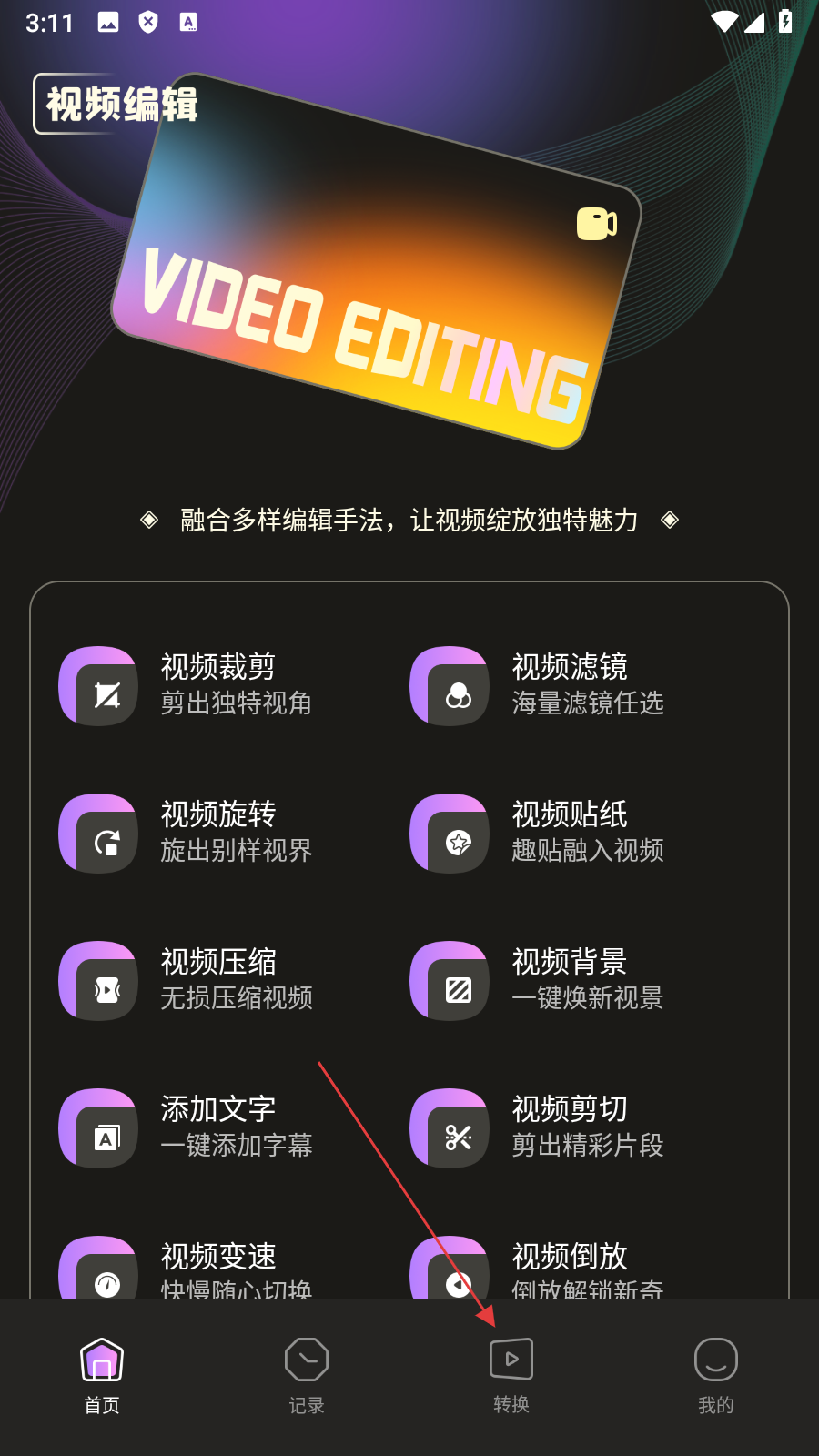 1、在视频编辑首页,点击底部【转换】,进入视频转换页面。